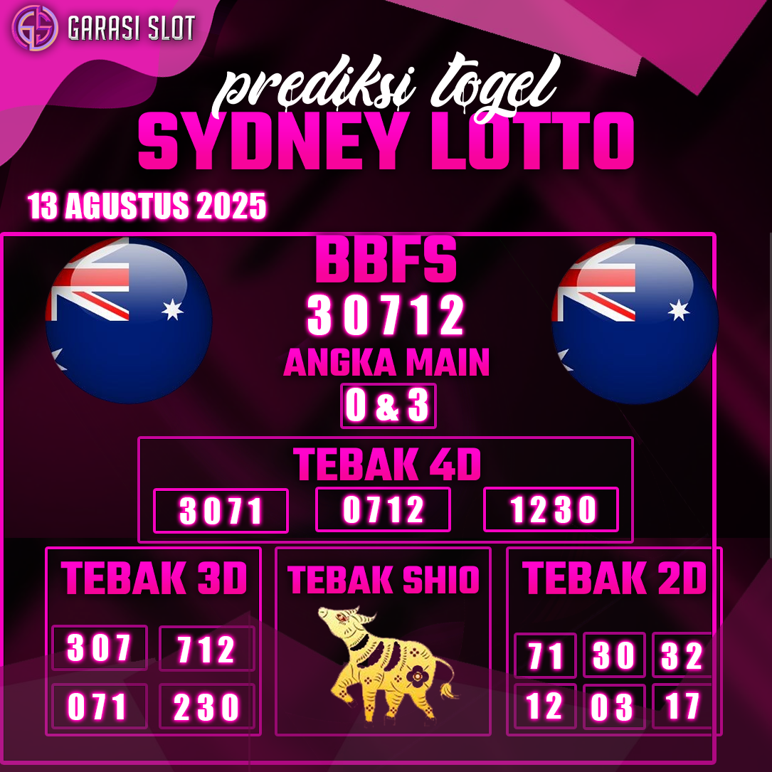 Prediksi togel Sydney hari ini yang ditawarkan GARASISLOT akan membantu Kamu dalam menyelesaikan catatan menyiapkan angka main. Prediksi GARASISLOT adalah halaman khusus untuk membocorkan angka prediksi seputaran pasaran togel terbesar di Indonesia. Hasil prediksi yang dirilis oleh tim khusus situs togel terpercaya GARASISLOT ini mempunyai tingkat akurat terbaik.