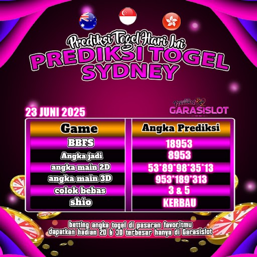 Togel SYDNEY adalah pasaran terlaris yang hampir tidak pernah tergantikan. Setiap harinya ribuan pengguna memburu dan mencari prediksi jitu seputaran togel Sydney hari ini. Nah, dibawah ini adalah prediksi togel Sydney Lotto 23 JUNI 2025 terbaik.