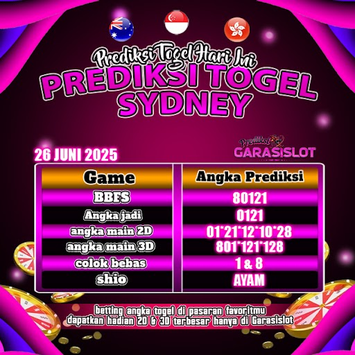 Prediksi togel Sydney hari ini yang ditawarkan GARASISLOT akan membantu Kamu dalam menyelesaikan catatan menyiapkan angka main. Prediksi GARASISLOT adalah halaman khusus untuk membocorkan angka prediksi seputaran pasaran togel terbesar di Indonesia. Hasil prediksi yang dirilis oleh tim khusus situs togel terpercaya GARASISLOT ini mempunyai tingkat akurat terbaik.