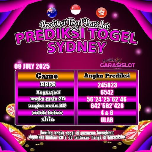 Togel SYDNEY adalah pasaran terlaris yang hampir tidak pernah tergantikan. Setiap harinya ribuan pengguna memburu dan mencari prediksi jitu seputaran togel Sydney hari ini. Nah, dibawah ini adalah prediksi togel Sydney Lotto 09 JULY 2025 terbaik.